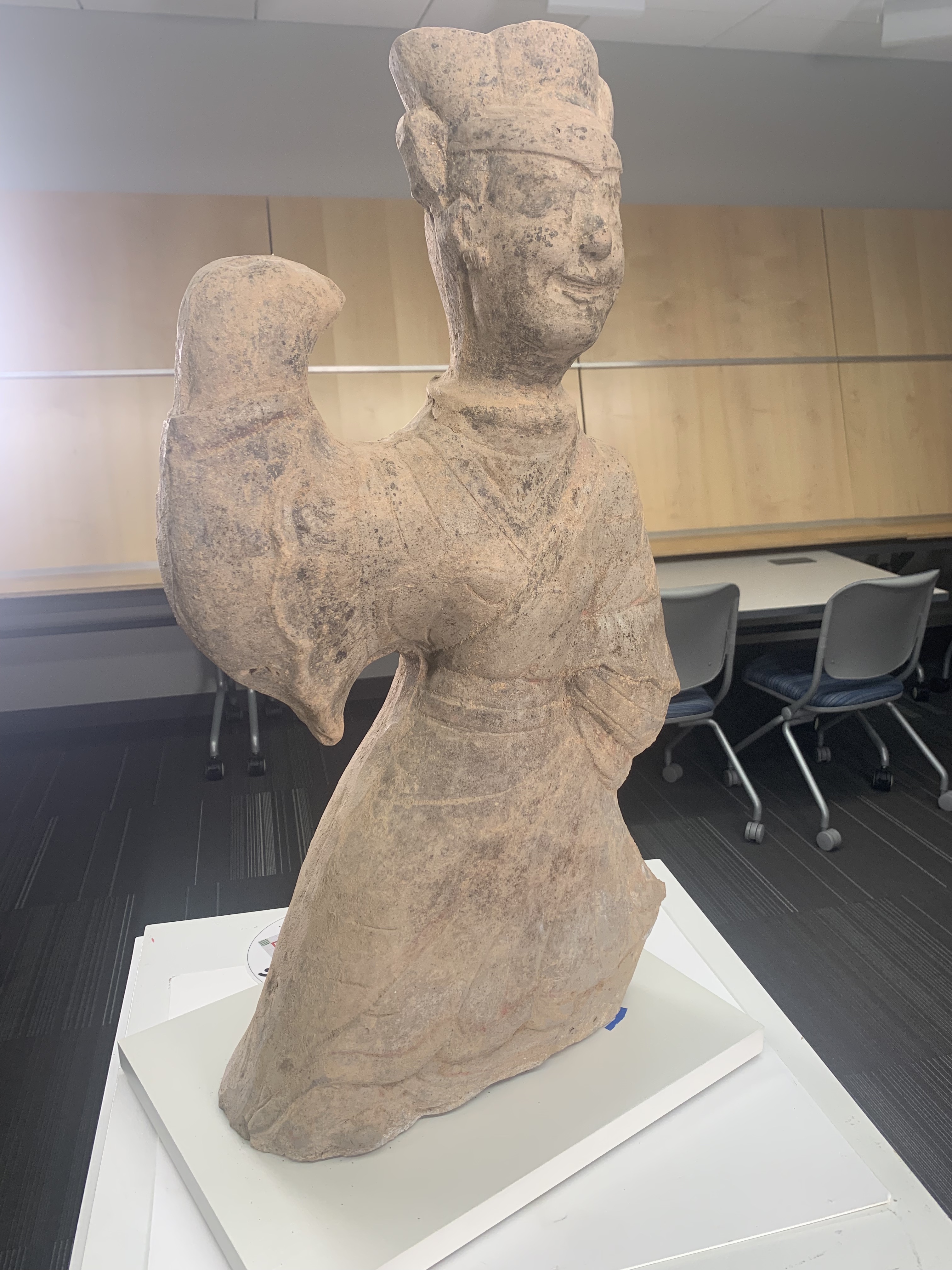 - This is a ceramic statue of a female dancer that was found in a tomb in Sichuan, China. The dancer is standing straight up with the right arm raised, and her face seems to be in a smile. She is wearing an ornate robe and a headpiece, and the remains of texture on it can still be seen with the naked eye.