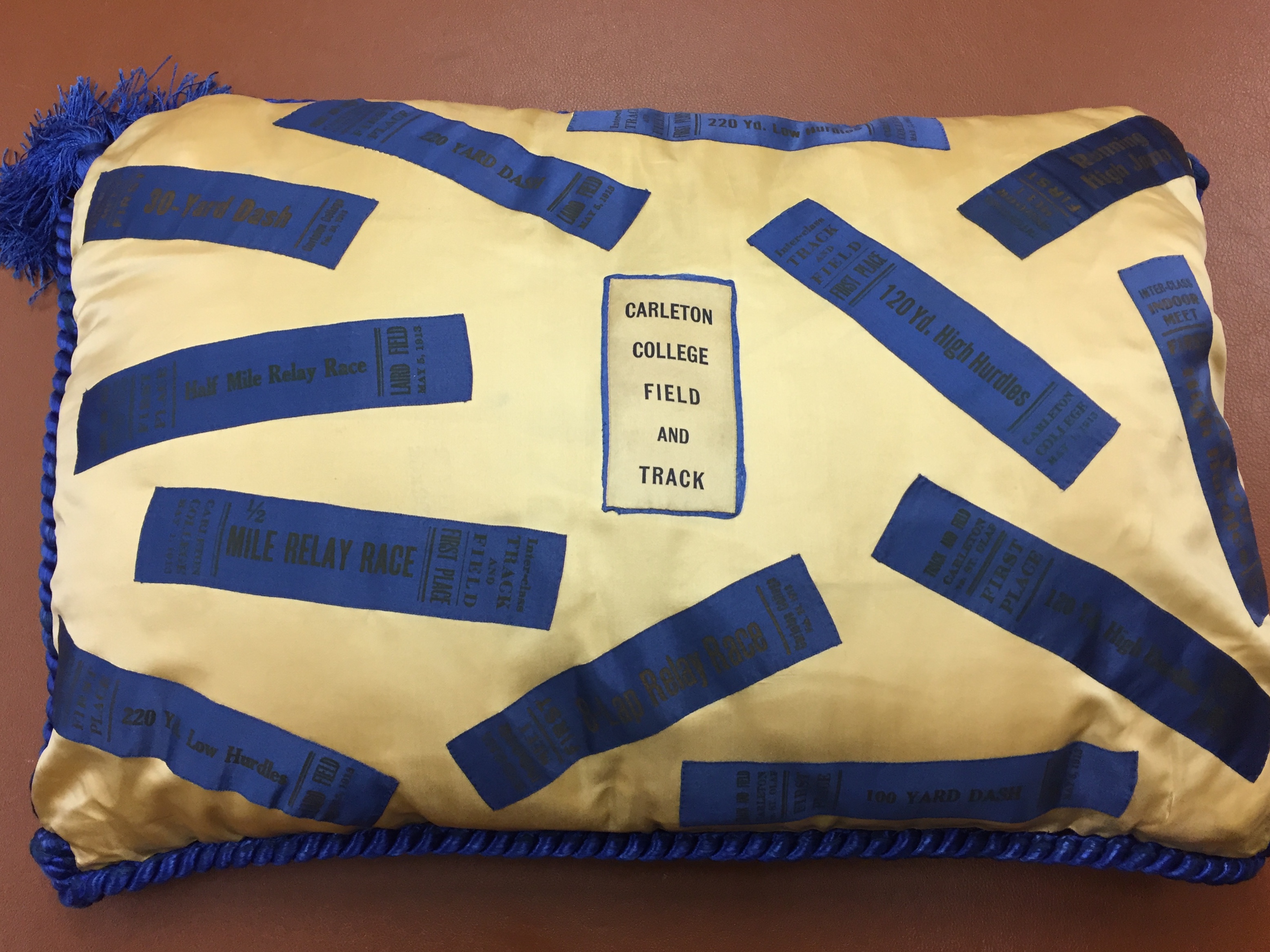 - Blue and gold pillow covered in ribbons won by Carleton in various track and field events in 1913