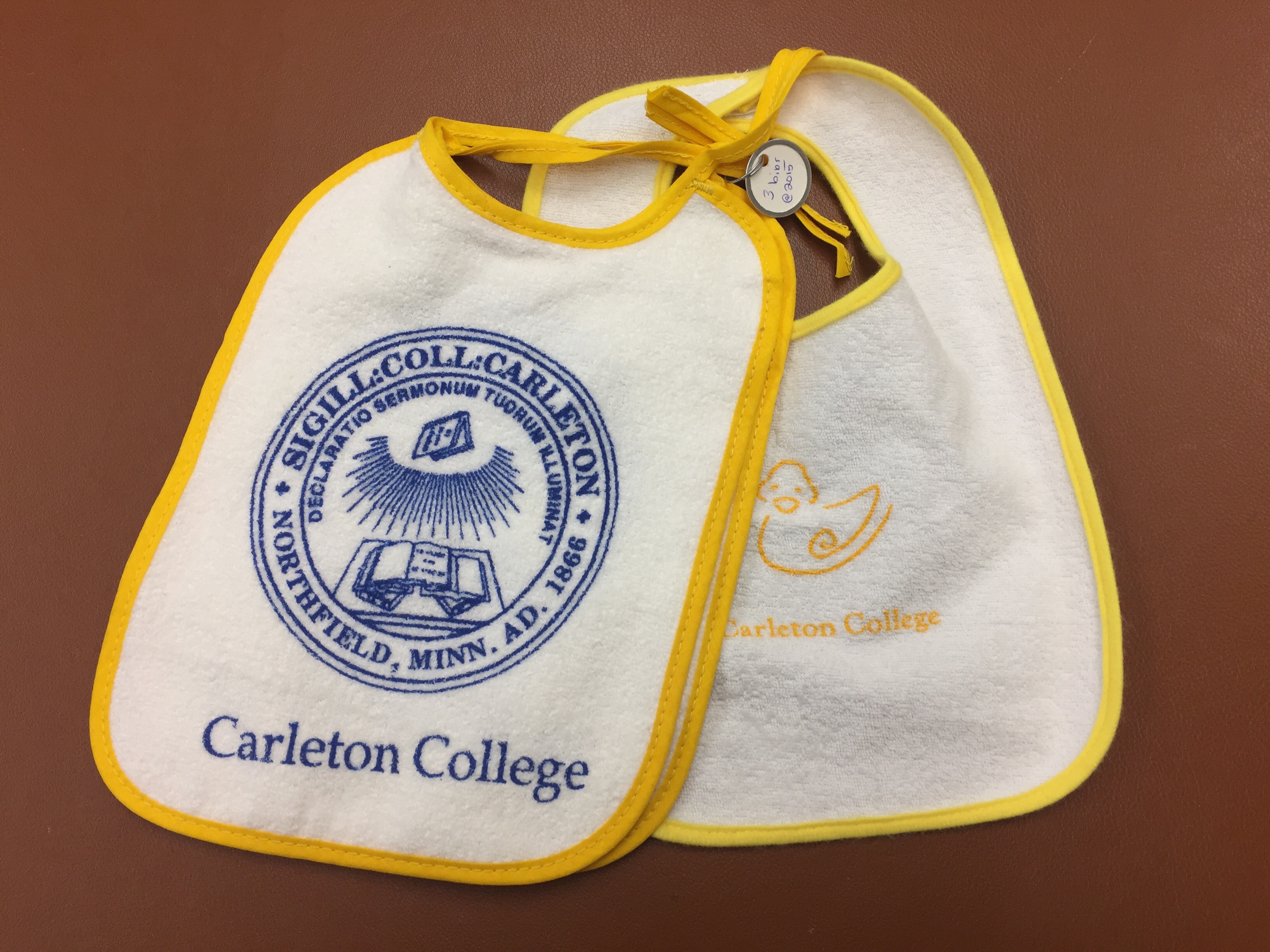 - 3 white Carleton bibs with yellow trim, two are identical and have the Carleton seal on them and read "Carleton College" in blue lettering, while the other has a yellow duck on it and reads "Carleton College" in yellow lettering