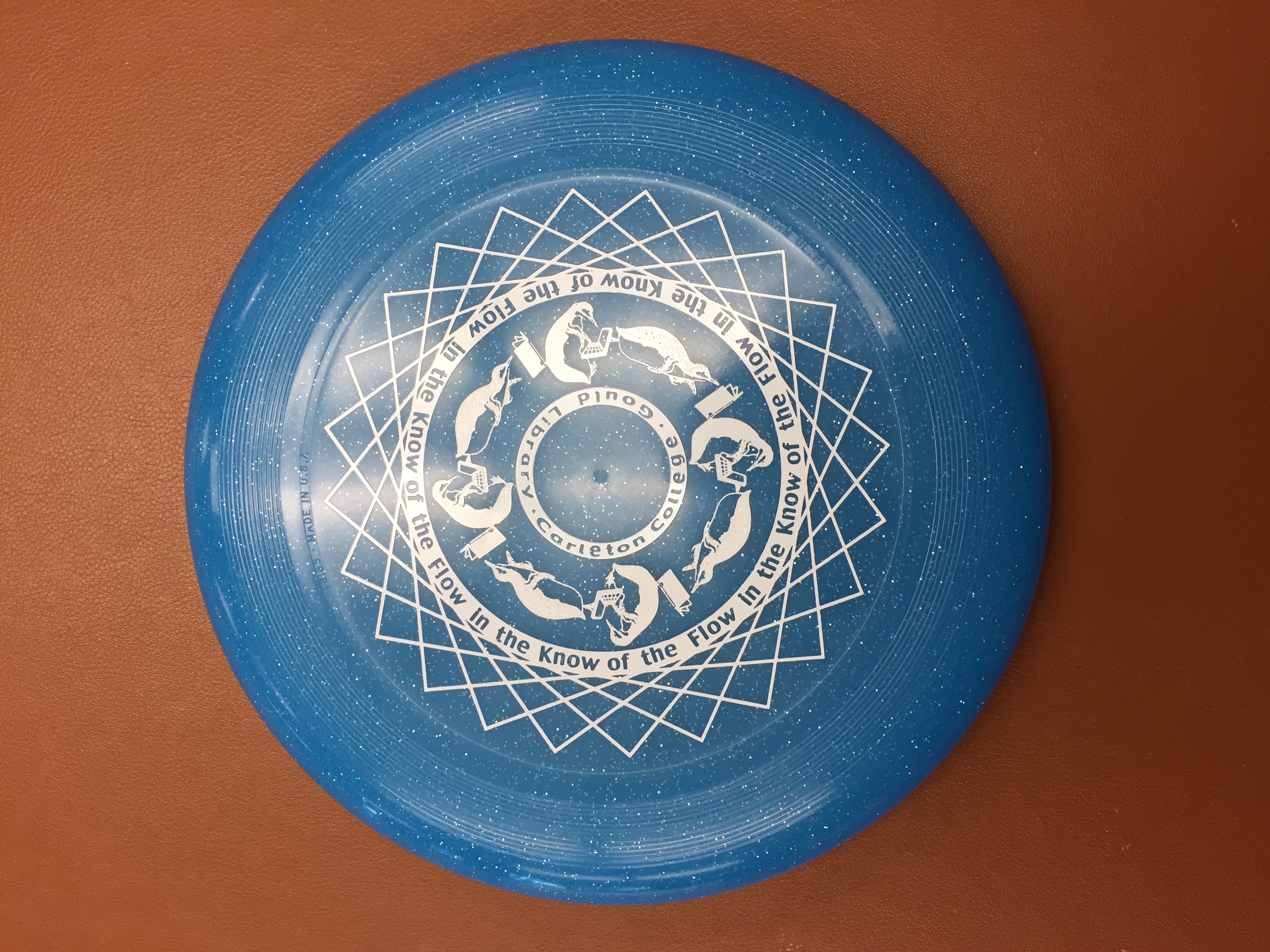 - Blue frisbee with a white design. Has images of penguins reading and on computers, says "Flow in the Know of the Flow, Gould Library, Carleton College"